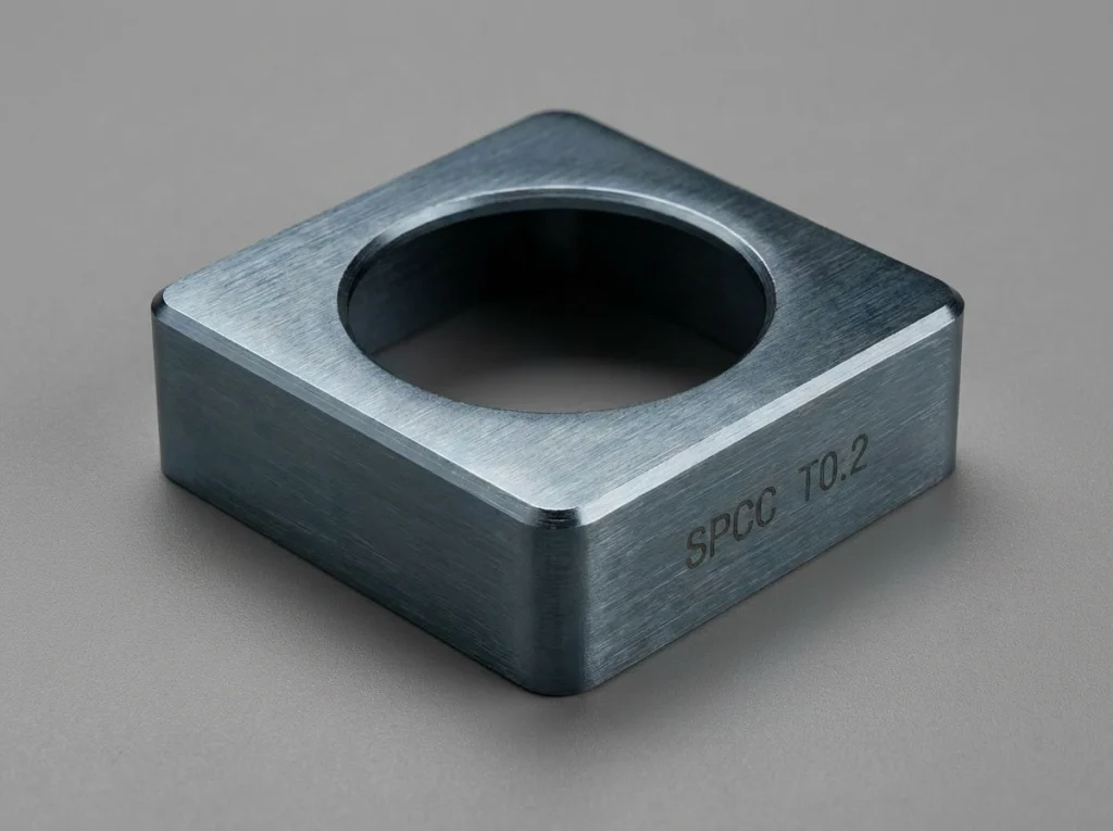 まず、8mm×8mm×2.5mm・板厚0.2mmという絞り品の形状特性と、SPCC材の機械的特性を詳細に分析しました。バリの発生箇所・サイズ(10µm程度)を確認したうえで、変形リスクとバリ除去精度の両立が可能な工程を設計しました。