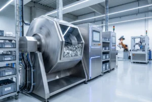SPCC絞り品の全周バリ取り|薄板変形ゼロ・10µm精密バリ管理の回転バレル研磨事例